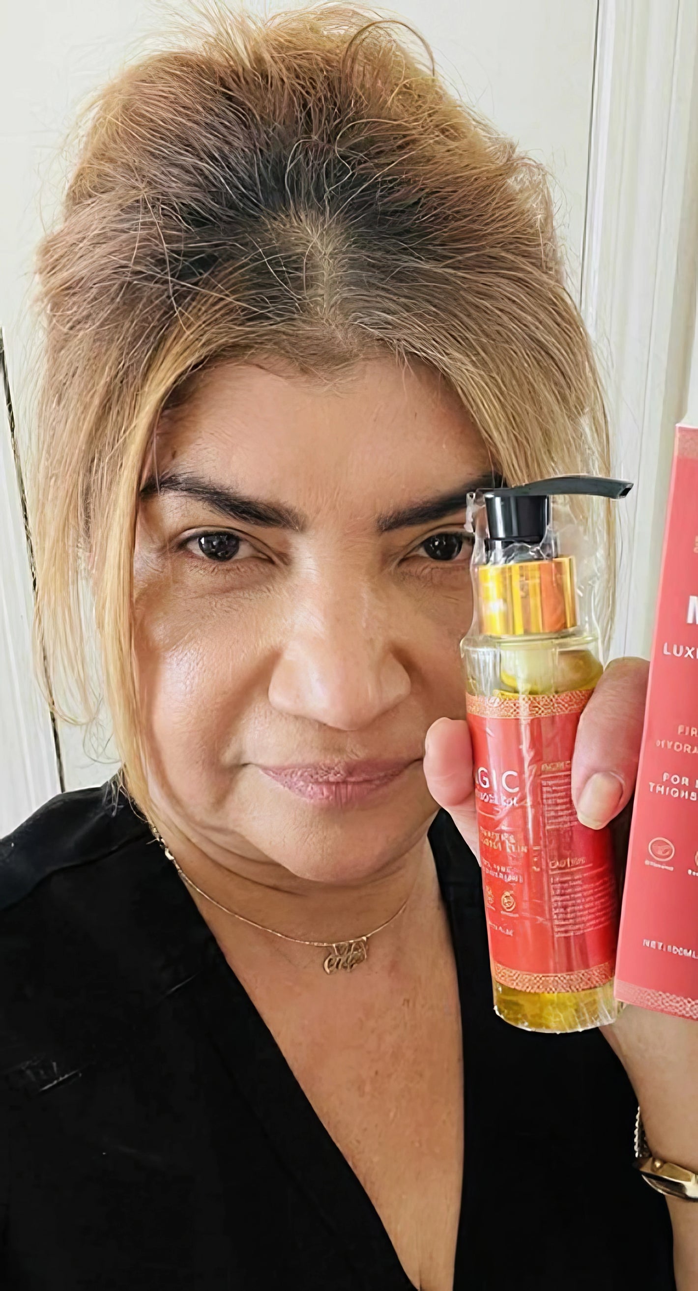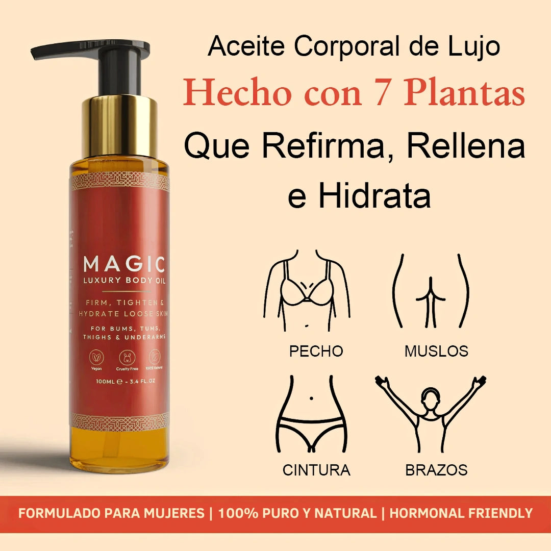 Nuestro aceite corporal de lujo Magic es tu arma secreta para lograr la piel suave, tonificada y radiante que siempre has soñado. Repleto de poderosos ingredientes naturales como pachulí, rosa mosqueta y geranio, este sedoso elixir nutre, reafirma y rejuvenece profundamente, ayudándote a redescubrir tu yo más seguro y sexy a cualquier edad.